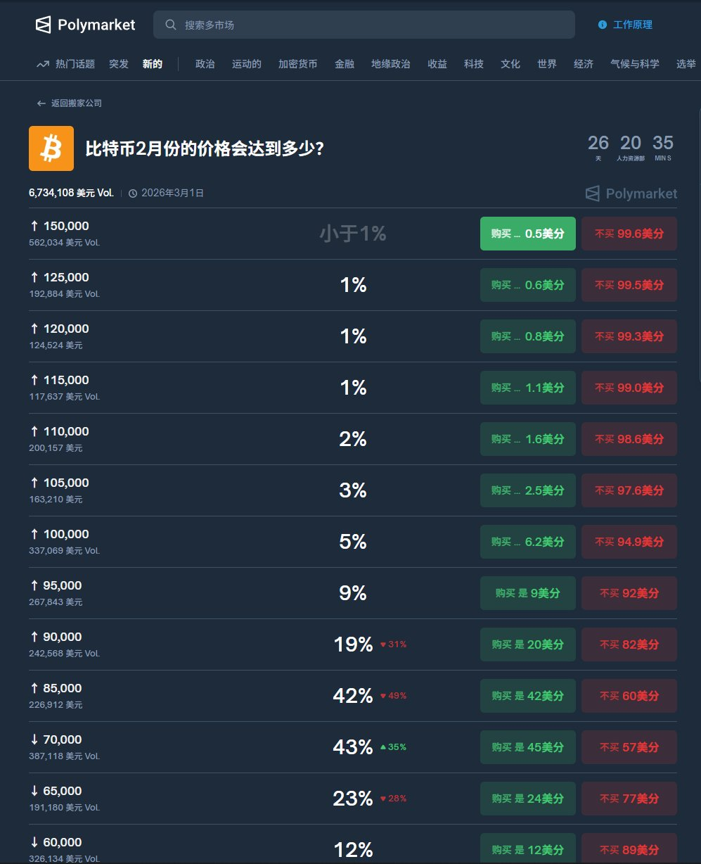polymarket账户:https://polymarket.com/event/what-price-will-bitcoin-hit-in-february-2026/will-bitcoin-dip-to-75k-in-february-2026