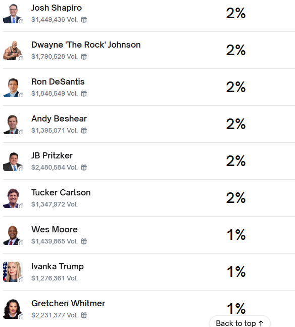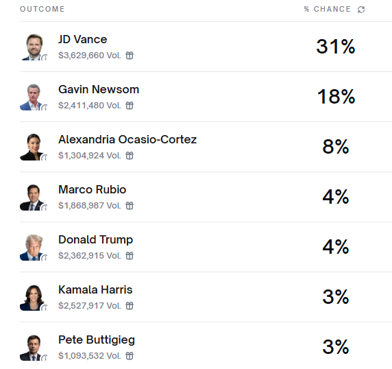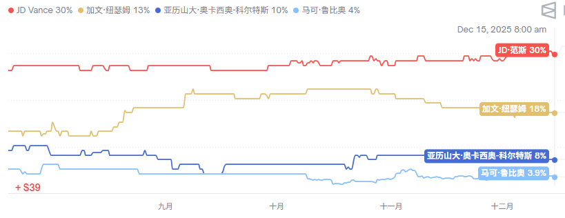 在过去一周,几项事态发展影响了2028年总统大选候选人的胜算。JD·范斯以30.5%的领先概率领先,支持度激增,社交媒体和近期民调显示他迄今为止的胜算最高,使他成为明显的领先者。加文·纽瑟姆以17.5%的得票率成为民主党有力竞争者,近期新闻强调他与党内成员的共鸣以及他作为共和党人物的直言不讳挑战者的角色。亚历山大·奥卡西奥-科尔特斯以7.5%的得票率在年轻选民中持续获得支持,近期报道指出她在具体民调中领先范斯,尽管她的总统竞选前景因潜在参议院竞选的猜测而仍不明朗。