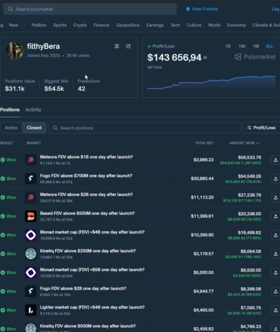 过去一年里,有一批交易者在 Polymarket 上,用同一套极其简单的策略,累计赚取了 24 万美元以上。这不是高频,不是内幕,也不是运气。它甚至不需要你懂太多技术。你只需要接受一个现实:绝大多数加密项目,在 TGE 时被严重高估。
