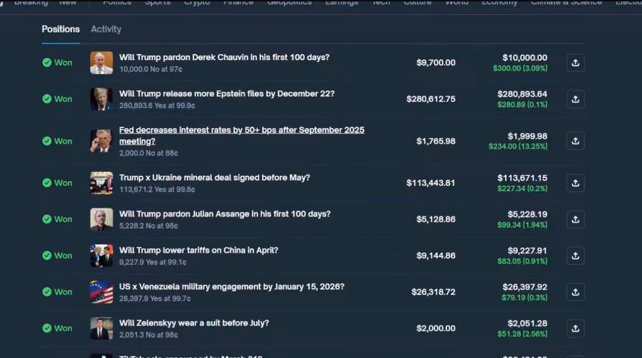 👇从交易记录来看,其明显擅长在高确定性市场中进行布局,精准把握「类债券」机会。