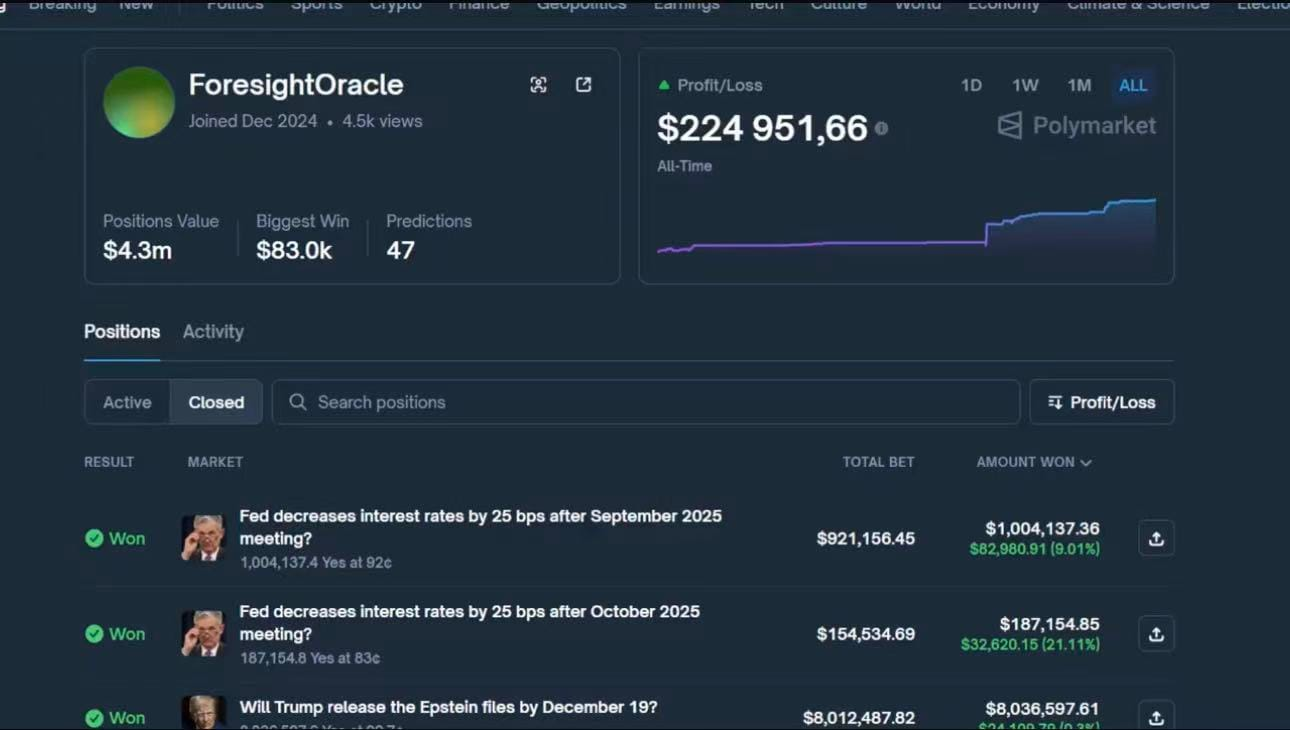 在 Polymarket 上,有一位交易员 预见神谕,长期稳定地运用该策略,并取得了非常亮眼的成绩: