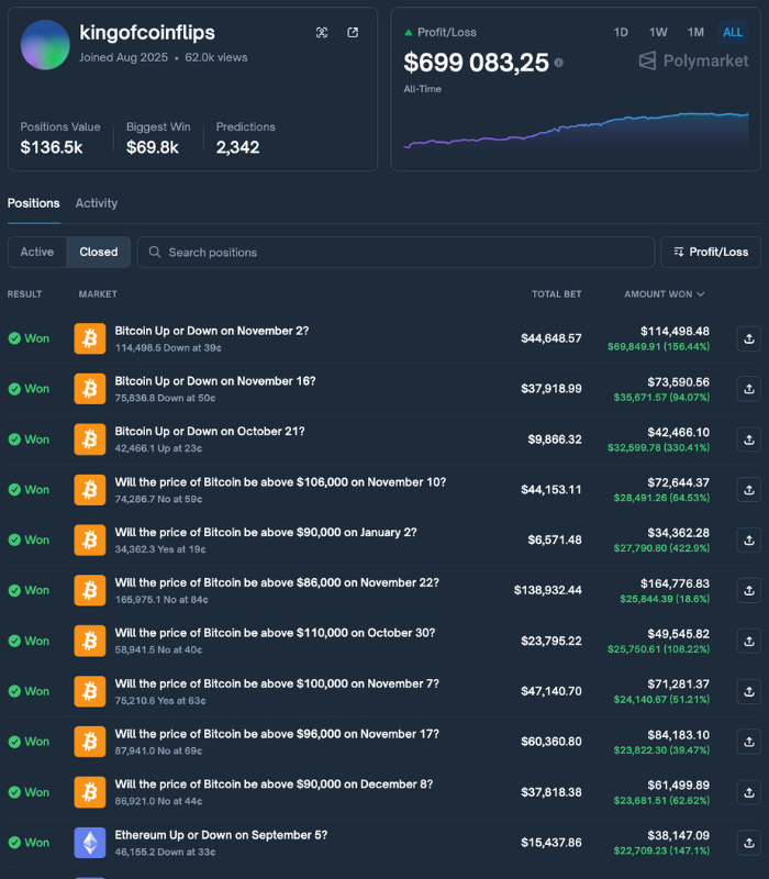 不是研究宏观,不是看 K 线,只是无意识地往下滑,然后,一个钱包被点开了。5 个月,净赚 69.9 万美元。名字随意得不像真的:kingofcoinflips(掷币王)。