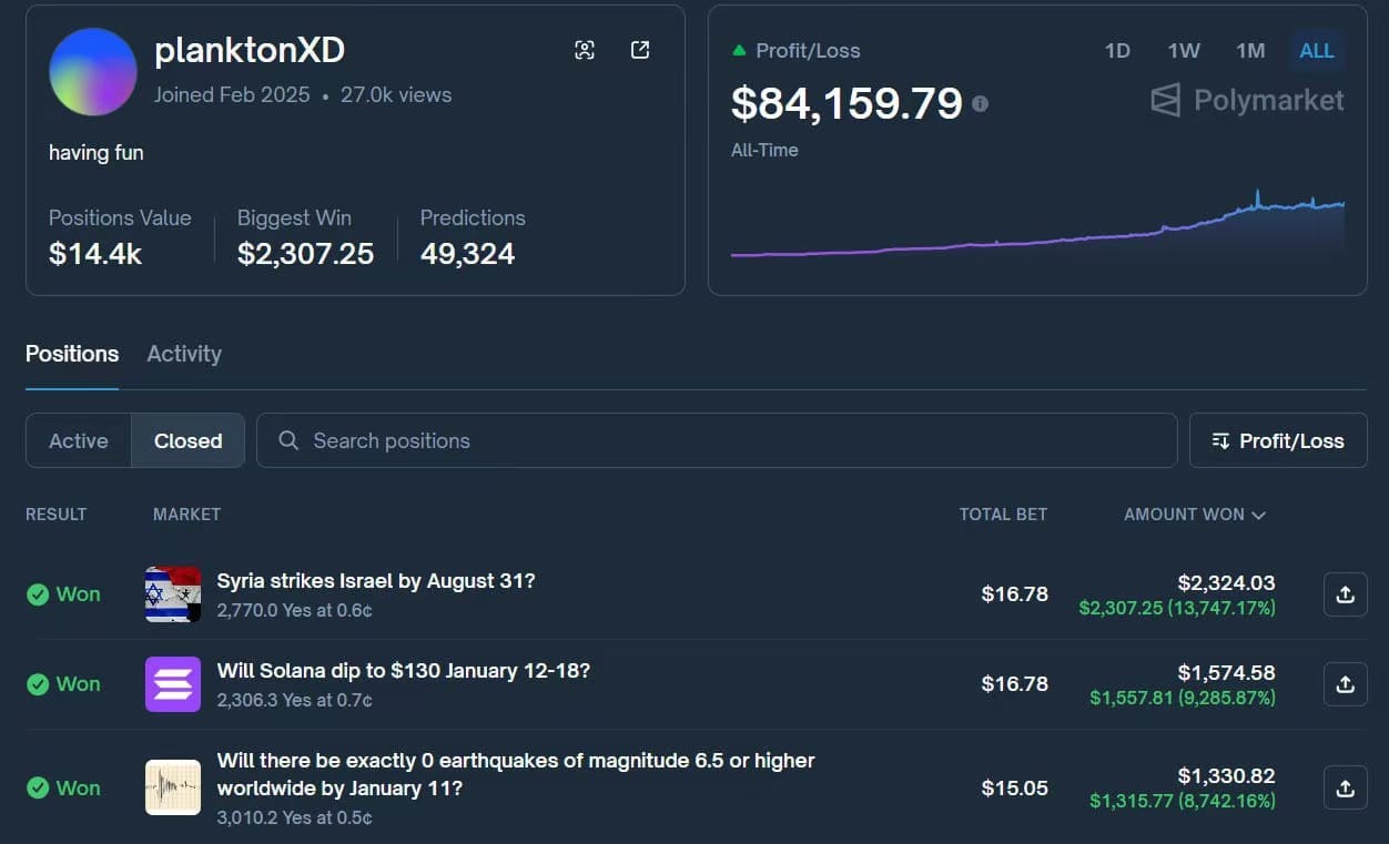 自 2025 年 2 月以来,Polymarket 上一个名为 planktonXD 的交易者,用接近 5 万次预测,把 $100 做到了 约 $80,000 的净收益。更夸张的是,他的很多指标,几乎完全违背直觉。