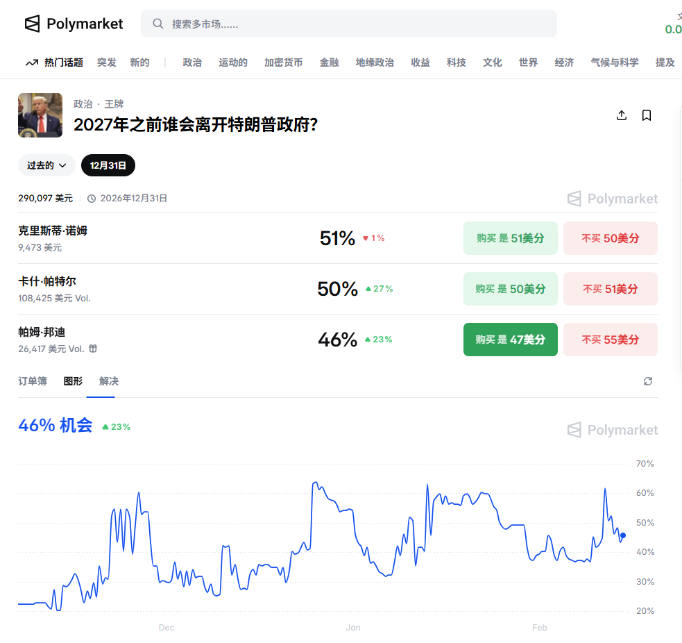 根据新闻报道引用的Polymarket 数据,在听证会及随后舆论发酵之后,关于“帕姆·邦迪是否会在 2027 年前离开或被撤离特朗普政府”的概率几乎翻倍。