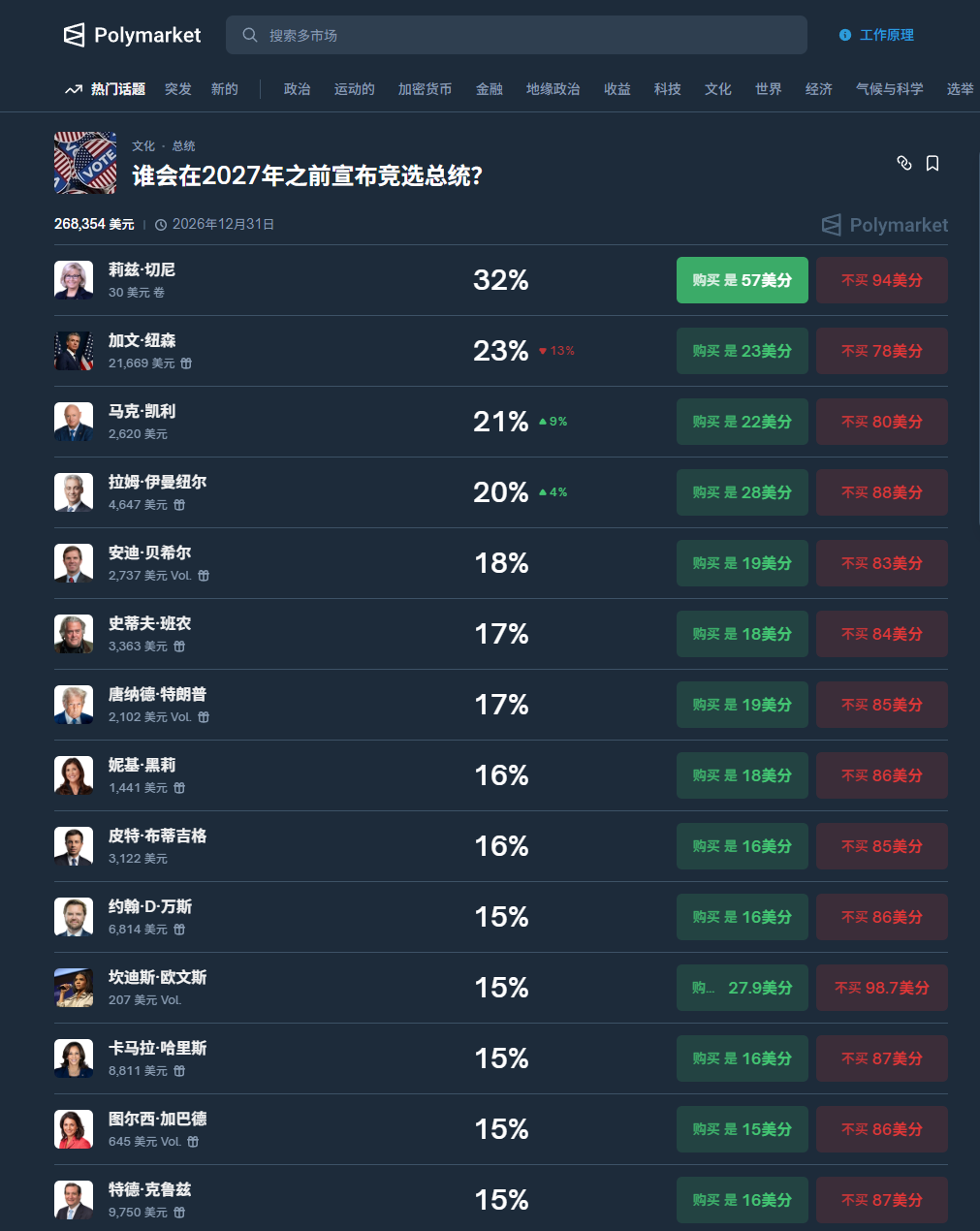 官宣之前的竞选:预测市场眼中的下一批总统候选人
