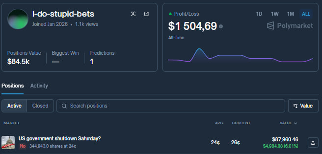 如果结果最终证明:周六没有发生停摆,他将拿下高达 $344,943 的收益。这种赔率结构意味着什么?意味着市场当下其实在“定价”一个不小的停摆风险,而他认为这个风险被夸大了。说白了就是:他押的不是新闻,而是“新闻带来的误价”。
