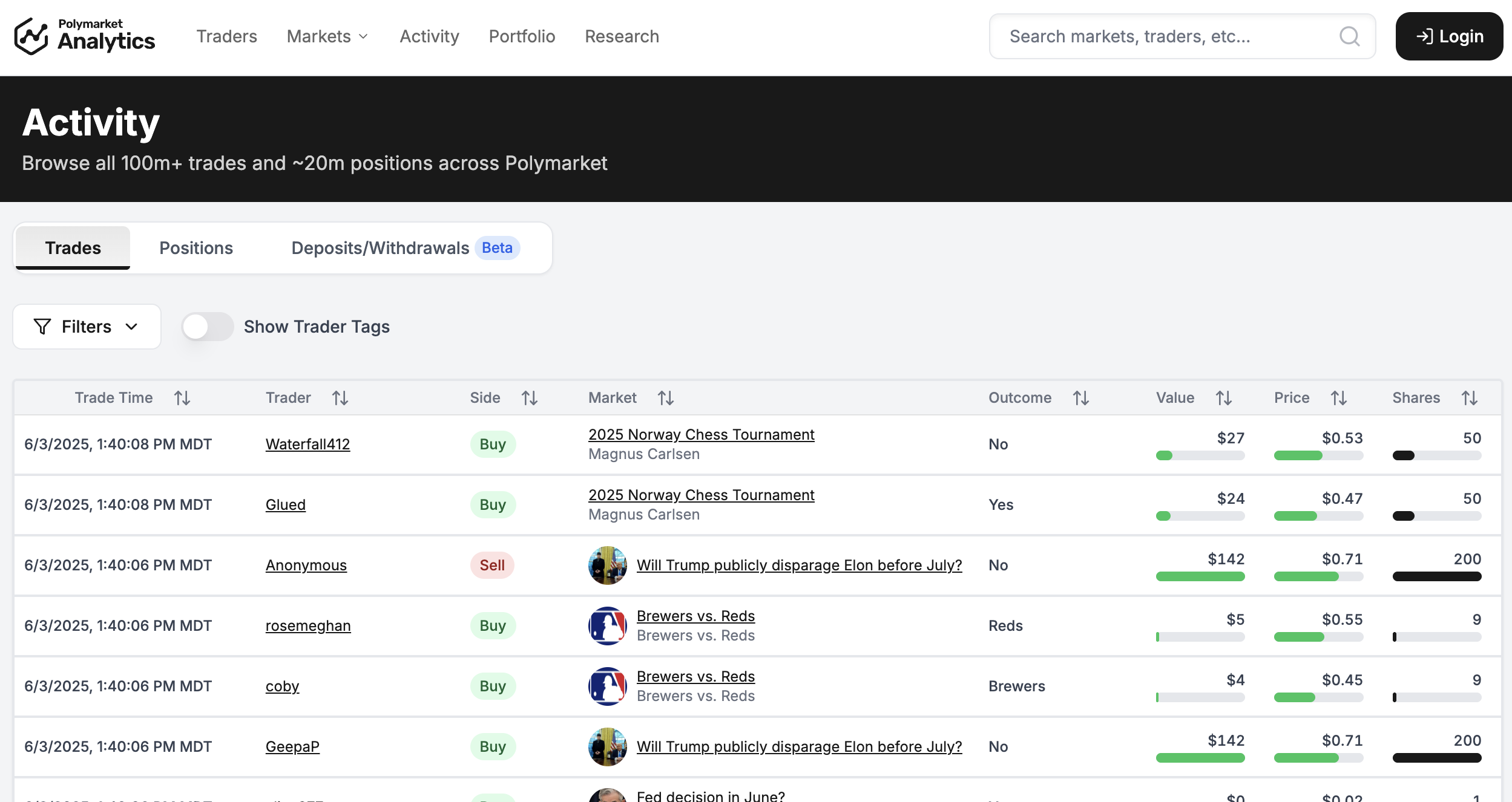- 可查看最活跃的交易者、市场份额及历史表现。