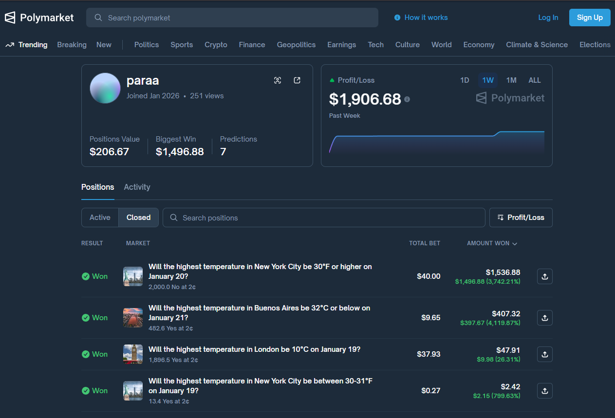 三天入场,一笔封神:Polymarket 新晋天气交易员的高风险豪赌