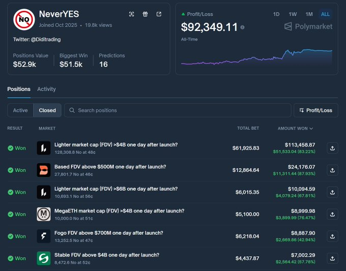 他并不是随便反向,而是专门挑选 FDV(完全稀释估值)相关的预测市场下手。当市场情绪最狂热、叙事最性感的时候——别人忙着算估值、画 K 线、推演「上线即万亿」他只问一个问题:这个项目,真的有可能以这么离谱的估值落地吗?多数时候,答案是否定的。