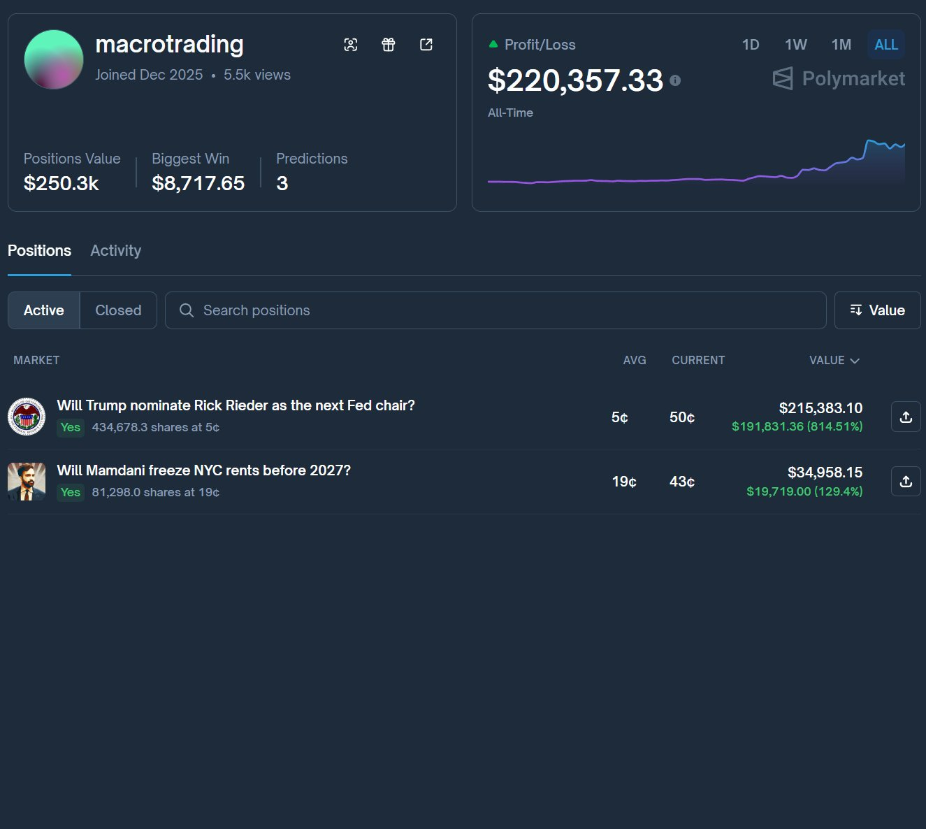 01.他最大的盈利:押“下一任美联储主席”,赚了 19.1 万美元