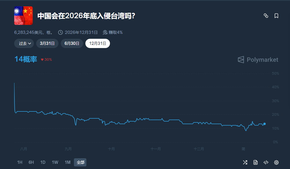 在全球金融与风险市场中,台海问题被纳入风险模型评估。预测市场给出分析,2026年中国对台湾采取军事行动的概率大致估算在约14%左右(此类概率为市场基于历史数据、地缘政治指标和风险模型的参考性分析,而非官方预测或确凿统计)。这种预测反映出: