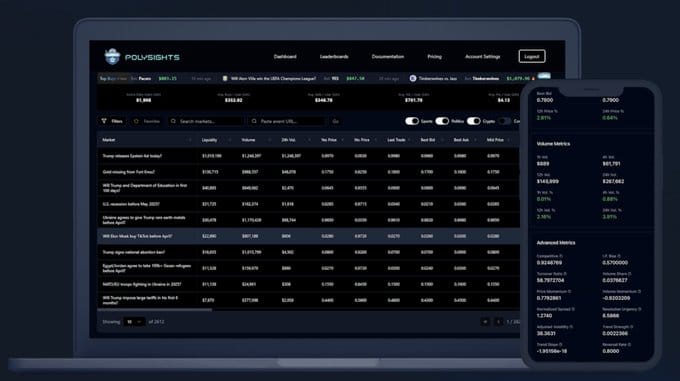 它显示了哪些数据:Polysights 会显示一个大型表格,其中每一行代表一个不同的市场(例如“比特币在 3 月份超过 10 万美元”或“特朗普赢得大选”)。每个市场都有 34 个以上的不同数据点可供查看,例如:所有人都能访问的标准指标: