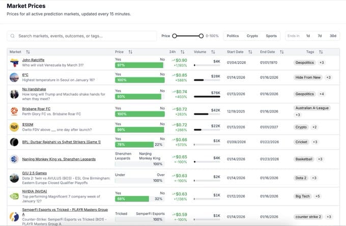 在一个统一的视图中搜索来自 Polymarket 和 Kalshi 的数千个预测市场。查找特定市场,比较不同平台的价格(用于套利),并跟踪实时价格走势。活动动态 实时动态显示: