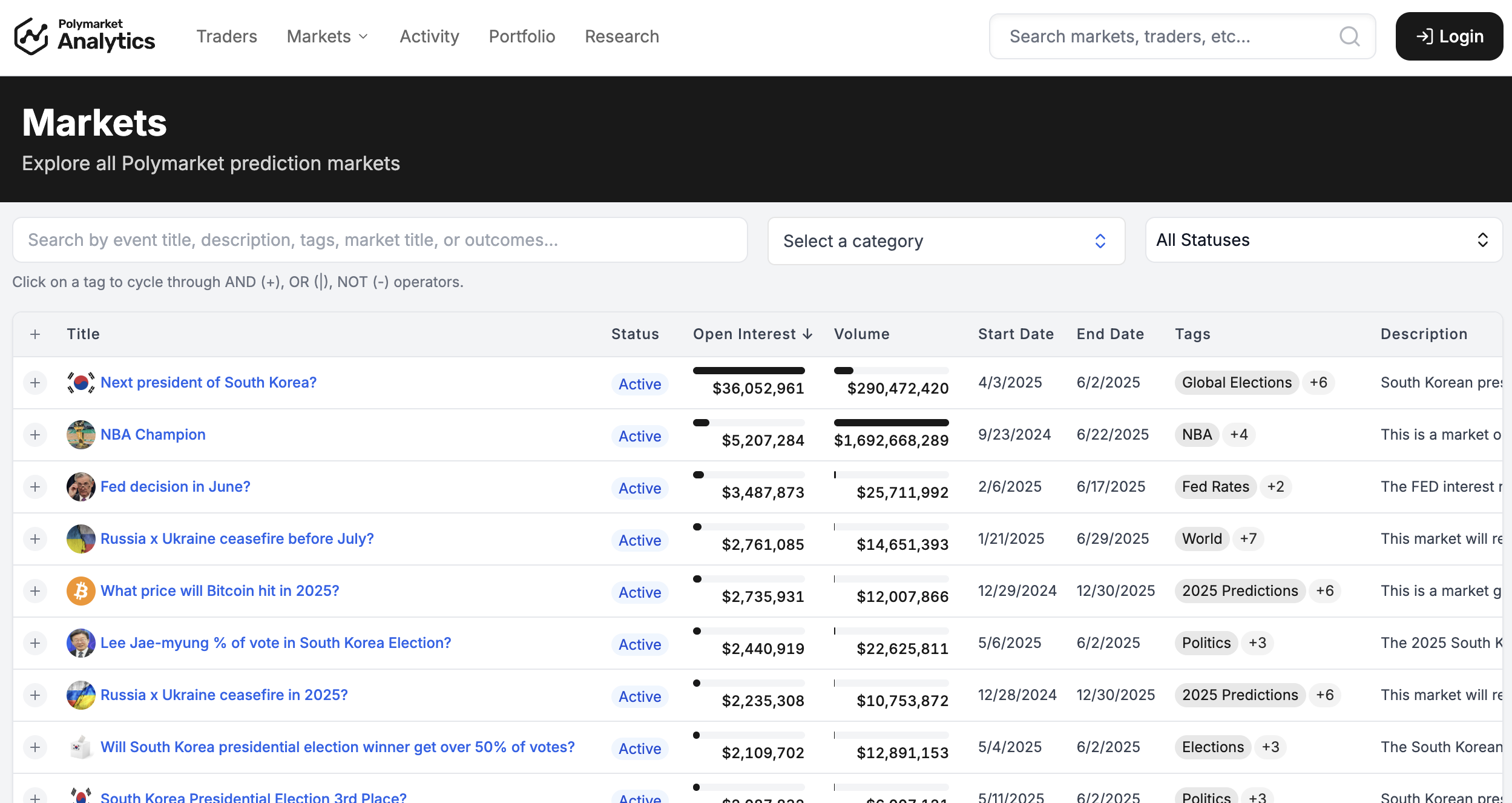 Polymarket Analytics 是最全面的预测市场公共数据库,追踪每位交易者、每个市场、每个持仓和每笔交易。数据通过 Goldsky 的基础设施每 5 分钟更新一次。