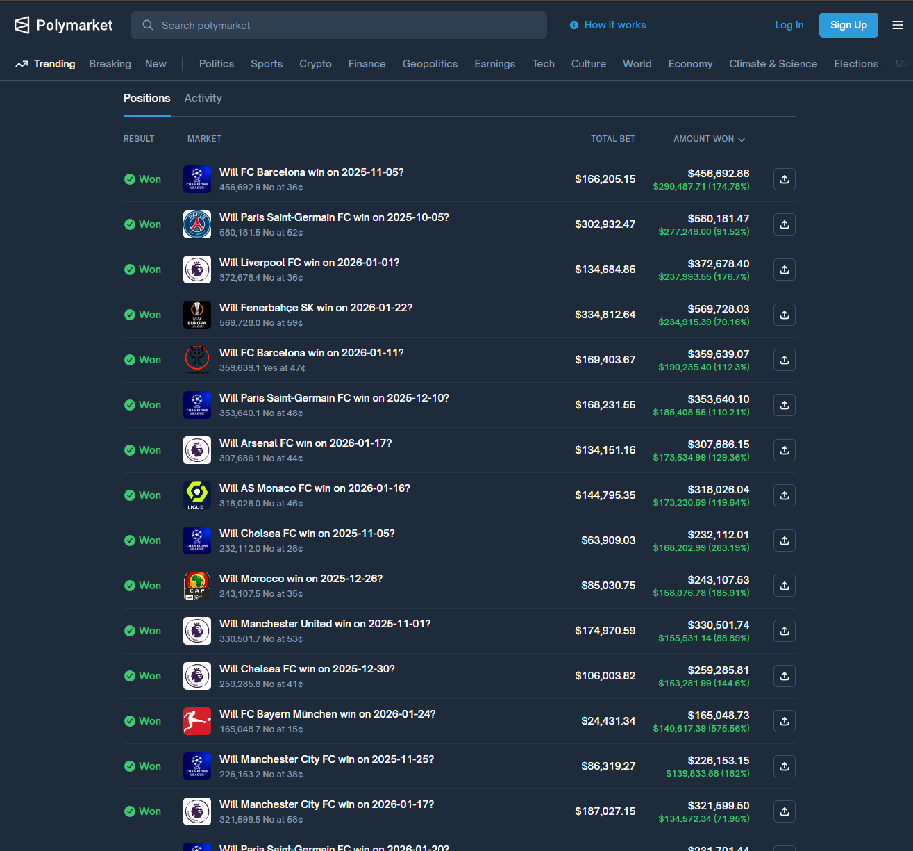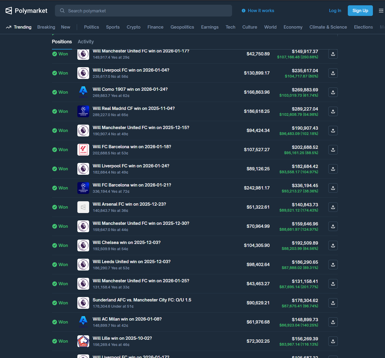 在体育和政治市场里,散户极其偏爱奇迹、逆转、黑天鹅。哪怕概率只有 1%,