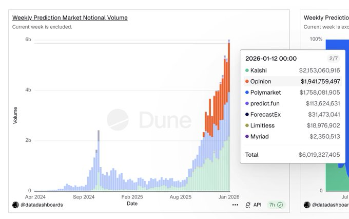 本周预测市场总名义交易量达到 $6.02B,其中前三平台占据了绝对主导地位。