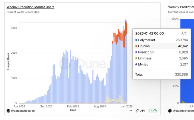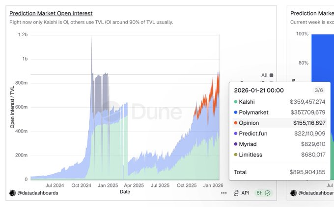 - Opinion Labs 的 OI 占比显著高于其交易频次,可能反映出更偏长期、结构化押注的市场设计。