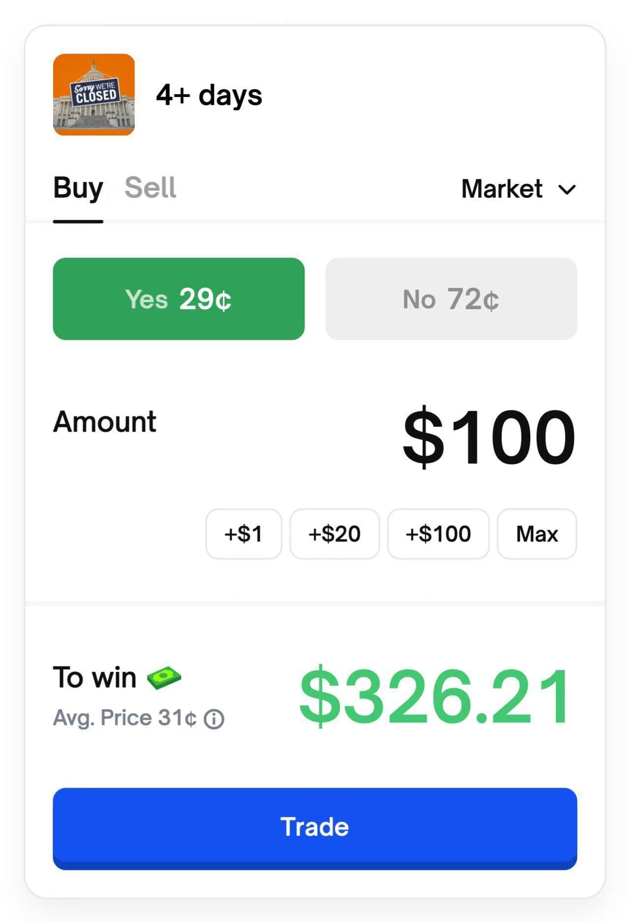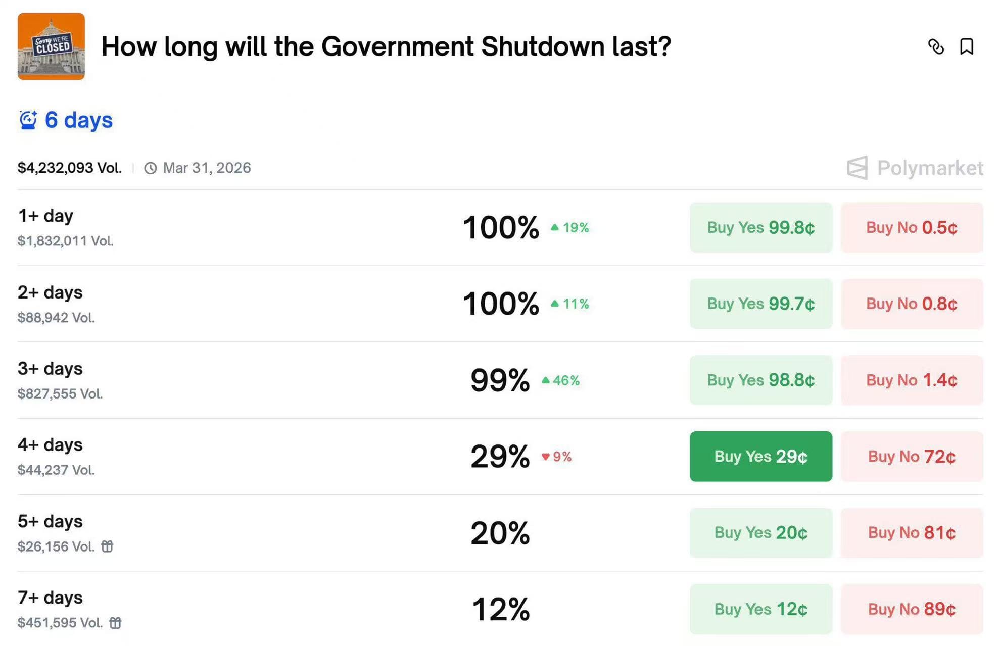 如果结合这些相关市场的价格结构与总交易量进行推算,交易者给出的隐含预期是:👉 本轮政府停摆大概率持续约 6 天左右。预测市场整体认同这一判断,在现实政治与经济约束下,3–6 天是一个相对合理、也最符合历史经验的区间。